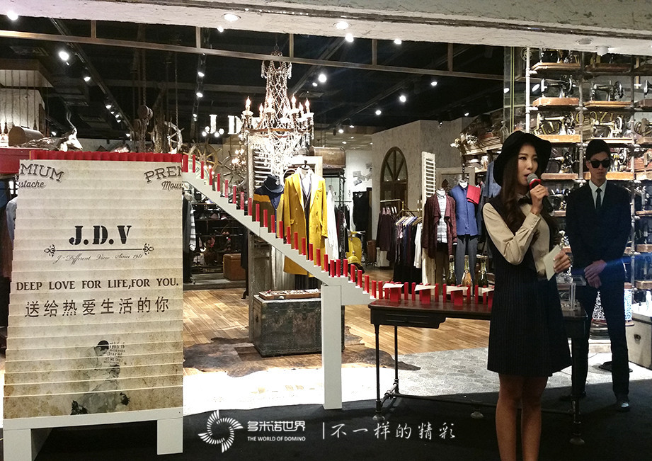 2015年9月12日,在時(shí)尚地標(biāo)-太古里,J.D.V三里屯店盛大啟幕?!岸嗝字Z世界”團(tuán)隊(duì)助陣,演繹酷炫時(shí)尚多米諾啟動(dòng)儀式,亞洲街舞王子黃景行與眾嘉賓共注香檳啟動(dòng)首枚骨牌,慶祝三里屯店開業(yè),隨后的超模服裝秀,異國風(fēng)情熱舞,令時(shí)尚氣息現(xiàn)場(chǎng)爆棚!