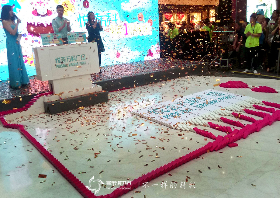 去年的更名儀式現(xiàn)場(chǎng),放飛了近千只蝴蝶,寓意“破繭成蝶、美麗新生”;今年的周年慶典更加別出心裁,特別邀請(qǐng)多米諾世界團(tuán)隊(duì),策劃設(shè)計(jì)了新穎時(shí)尚的多米諾啟動(dòng)儀式,用顧客寫(xiě)滿(mǎn)祝福的骨牌組成愛(ài)心圖案,碼放在悅薈萬(wàn)科LOGO畫(huà)面旁邊,令整幅多米諾圖案幸福感滿(mǎn)溢。