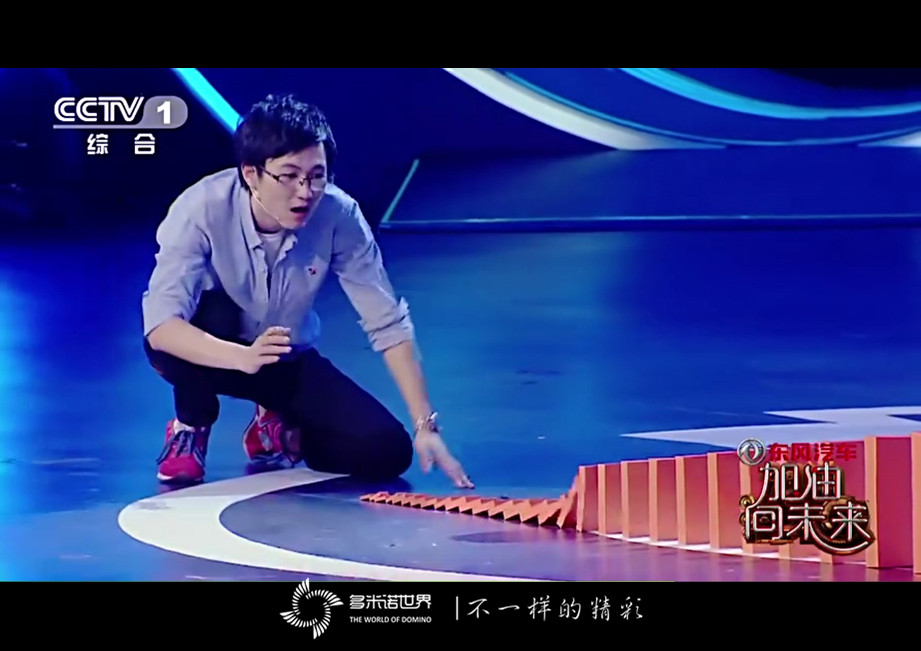 2016年8月7日,作為具有時(shí)代感、代表性的科學(xué)實(shí)驗(yàn)項(xiàng)目:多米諾骨牌,出現(xiàn)在《加油!向未來》第6期的節(jié)目中。本著嚴(yán)謹(jǐn)?shù)目茖W(xué)態(tài)度,節(jié)目攝制組特別邀請(qǐng)多米諾世界團(tuán)隊(duì),完成大小多米諾競速的科學(xué)試驗(yàn)。