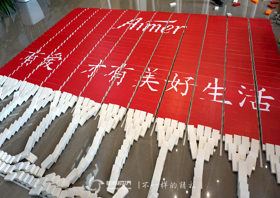 多米諾世界團(tuán)隊(duì)的老師,設(shè)計(jì)了一幅以“創(chuàng)造美、傳遞愛”為主題的多米諾畫卷。主題“揚(yáng)帆啟航”的風(fēng)帆圖案,寓意儲備干部團(tuán)隊(duì)將在愛慕揚(yáng)起風(fēng)帆;主題為”慕明而來“的愛慕大廈圖案,寓意新進(jìn)員工為了美好的明天加入愛慕大家庭;“創(chuàng)造美、傳遞愛”、“有愛才有美好生活”的主題畫面,以及一面彩虹骨牌墻,寓意了愛慕的美好未來。