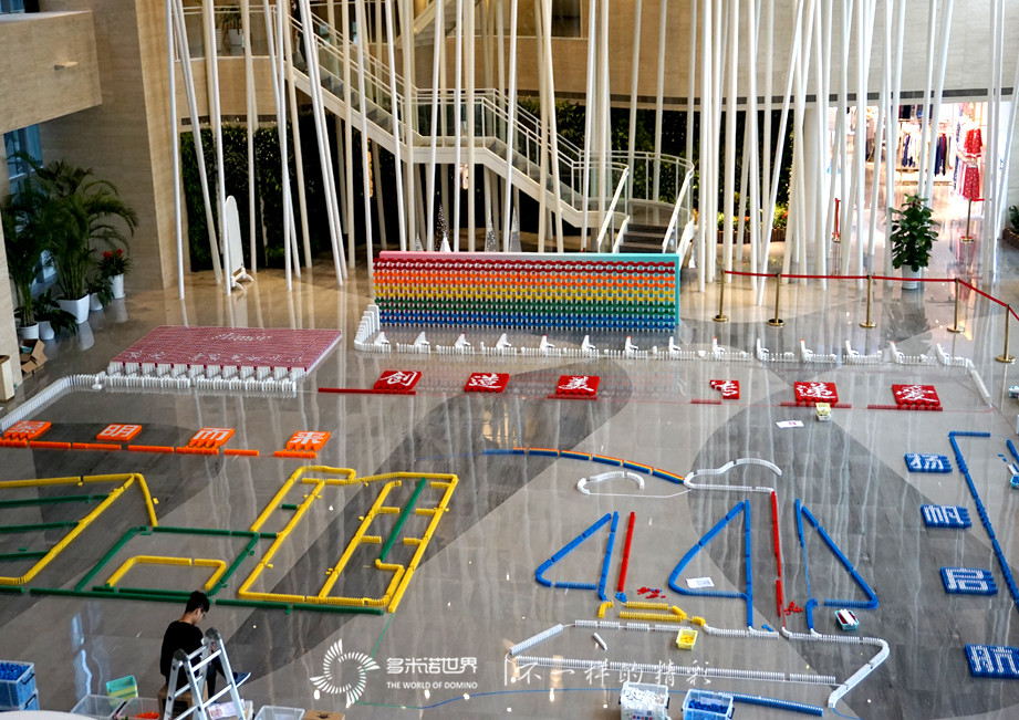 設(shè)計(jì)好的多米諾畫卷下方,還特別分出兩塊區(qū)域,由兩支隊(duì)伍分別完成兩幅創(chuàng)意作品,用骨牌展現(xiàn)團(tuán)隊(duì)的夢想,并設(shè)置了動畫裝置,將所有隊(duì)員的照片都展現(xiàn)出來。