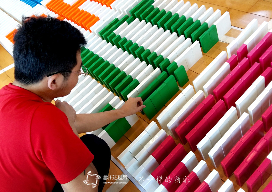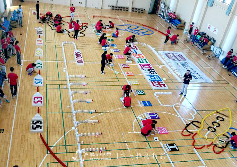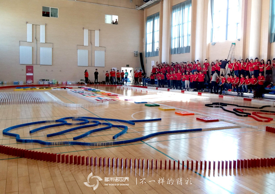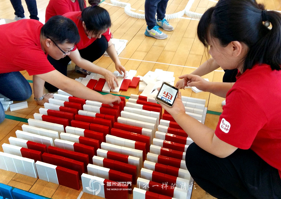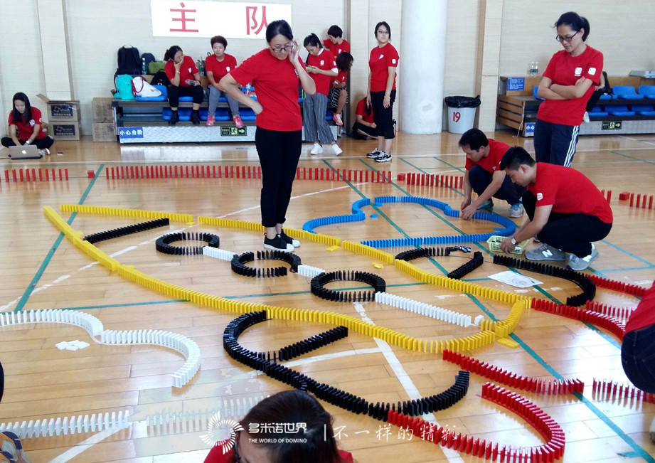 雖然大家都是第一次接觸多米諾運動,卻很快地掌握了骨牌的基本碼放方法,并能夠?qū)W⒌卮a放每一枚骨牌。雖然過程中也有失敗,但意外倒塌的骨牌并沒有打倒大家的自信,而是總結(jié)經(jīng)驗、從頭再來。在大家的齊心協(xié)力、共同努力下,一幅幅多米諾畫面成功碼放在地面上。