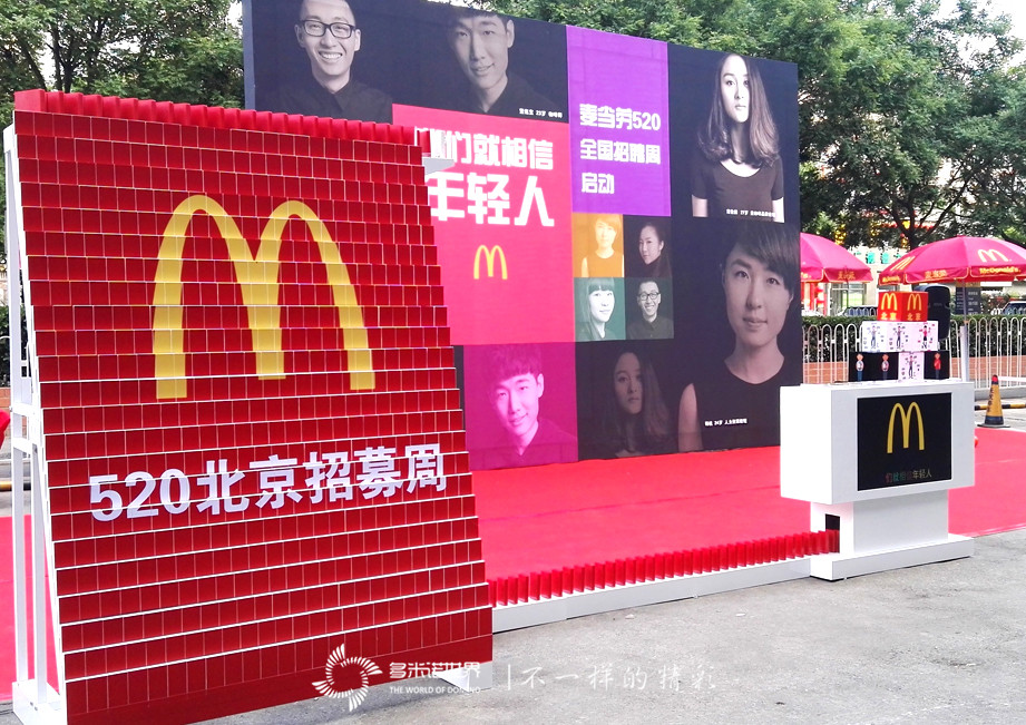 麥當(dāng)勞的520招聘周活動(dòng)自2012年開始,今年已經(jīng)是第五個(gè)年頭。此次繼續(xù)延續(xù)“我們就相信年輕人”的品牌主張,并特別邀請(qǐng)多米諾世界團(tuán)隊(duì),用青春時(shí)尚的多米諾作為此次活動(dòng)的啟動(dòng)儀式。