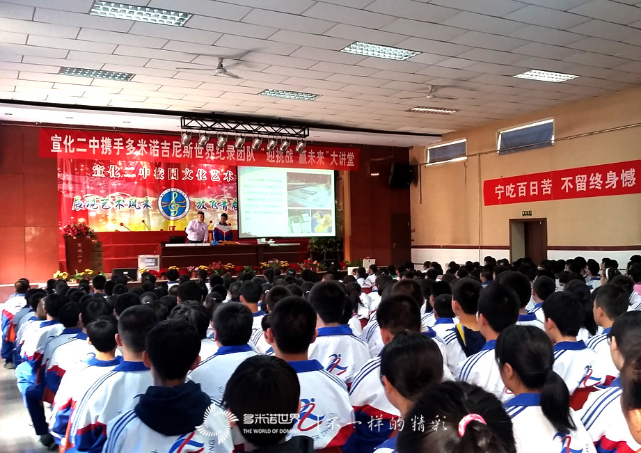 講座當天,主席臺懸掛的“宣化二中攜手多米諾吉尼斯紀錄團隊“迎挑戰(zhàn)、贏未來”大講堂”條幅分外耀眼,會場秩序井然、座無虛席。