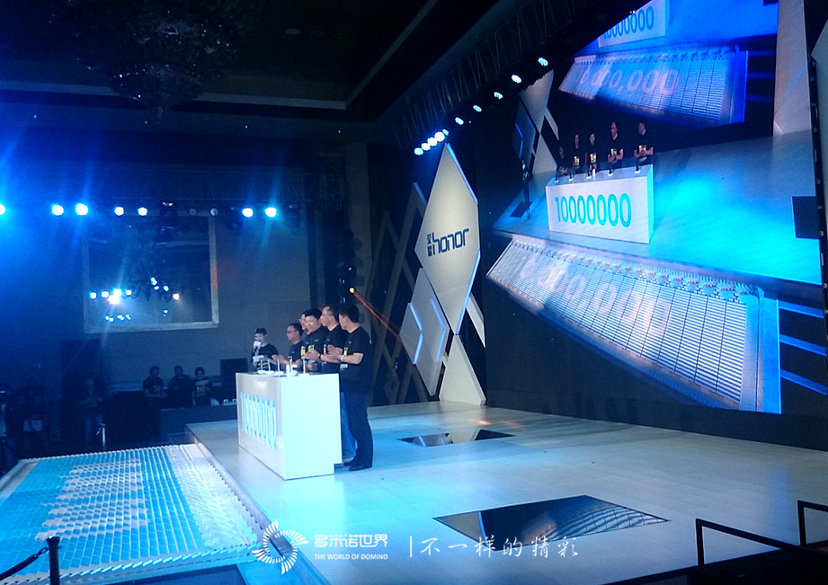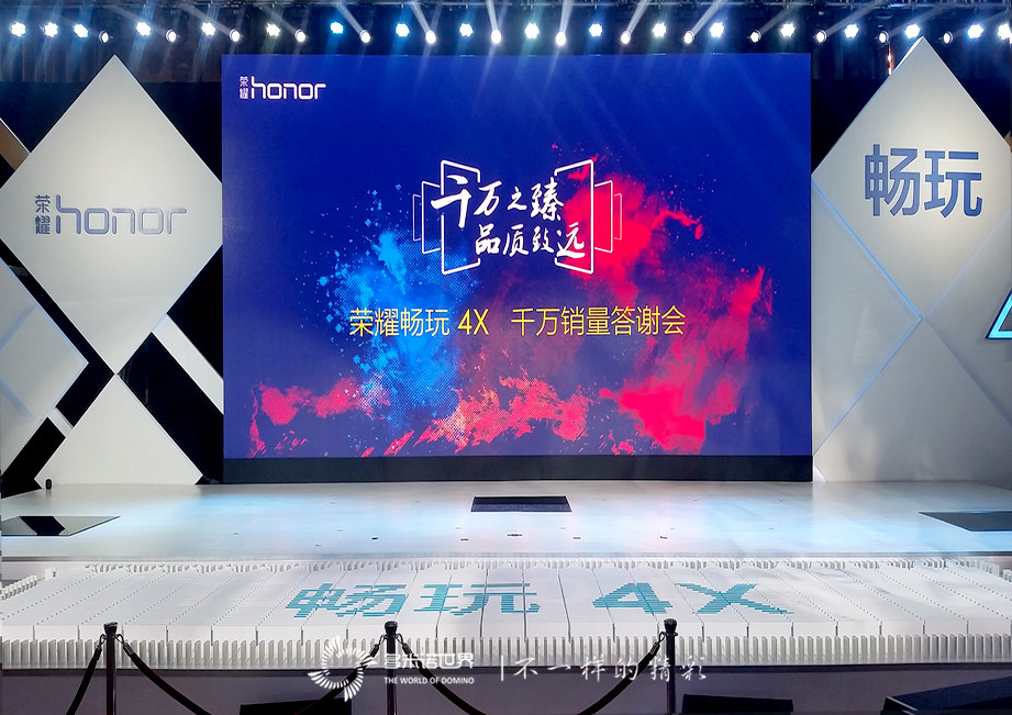 榮耀暢玩4X千萬銷量答謝會(huì)現(xiàn)場(chǎng),啟動(dòng)了由多米諾世界團(tuán)隊(duì)設(shè)計(jì)擺放的象征榮耀暢玩4X千萬銷量的多米多骨牌方陣,共同慶祝榮耀單品突破千萬銷量這一歷史時(shí)刻。