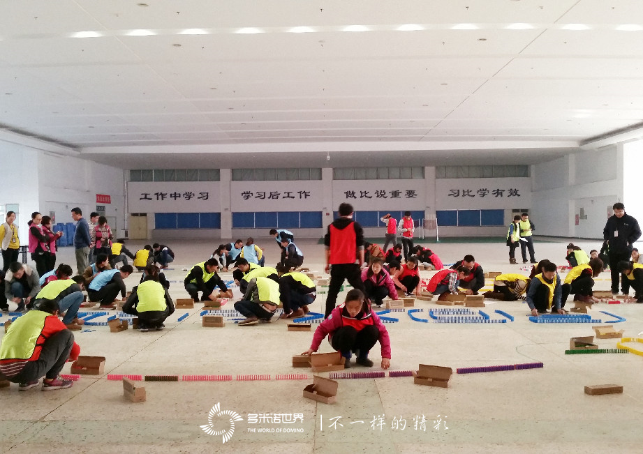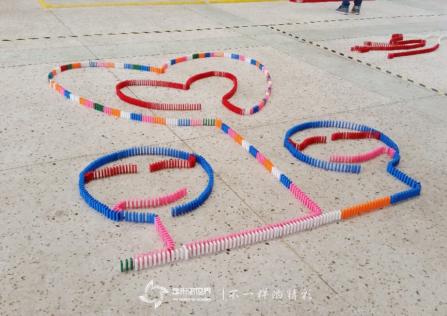 比賽分為四組,每個團隊給自己的組隊取了響亮的名字(雄鷹隊,富強隊,沖鋒隊,夢之隊)和有力的口號,大家根據自己的隊名,開始勾畫著創(chuàng)意,不斷地修改著,計算著用牌的數量,還要搭配顏色,希望把創(chuàng)意做到完美。這邊創(chuàng)意的場面熱鬧,那邊規(guī)定畫面的擺放也在井然有序地開展著。對于初次參與多米諾活動的隊員來說,今天的任務確實不容易,每個團隊都或多或少地出現了意外倒牌的現象,但是大家沒有絲毫的氣餒,表現出頑強的意志,越挫越勇,最終功夫不付有心人,完成了整體圖案的擺放。當最后一個連接點完成的時候,現場寂靜片刻之后,大家不約而同地鼓起了掌,為自己的努力鼓掌,為團隊合作的力量鼓掌,為大家的成果鼓掌。畫面依次展現,所有的骨牌完美呈現,這一刻,緊張的心情得到了釋放,成就感油然而生,歡呼雀躍,留下難忘的合影。