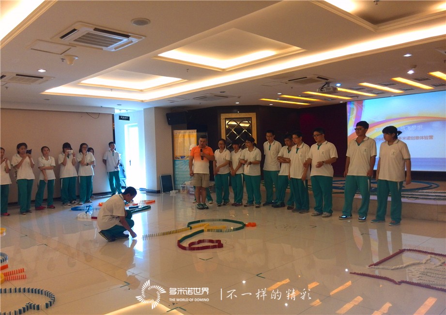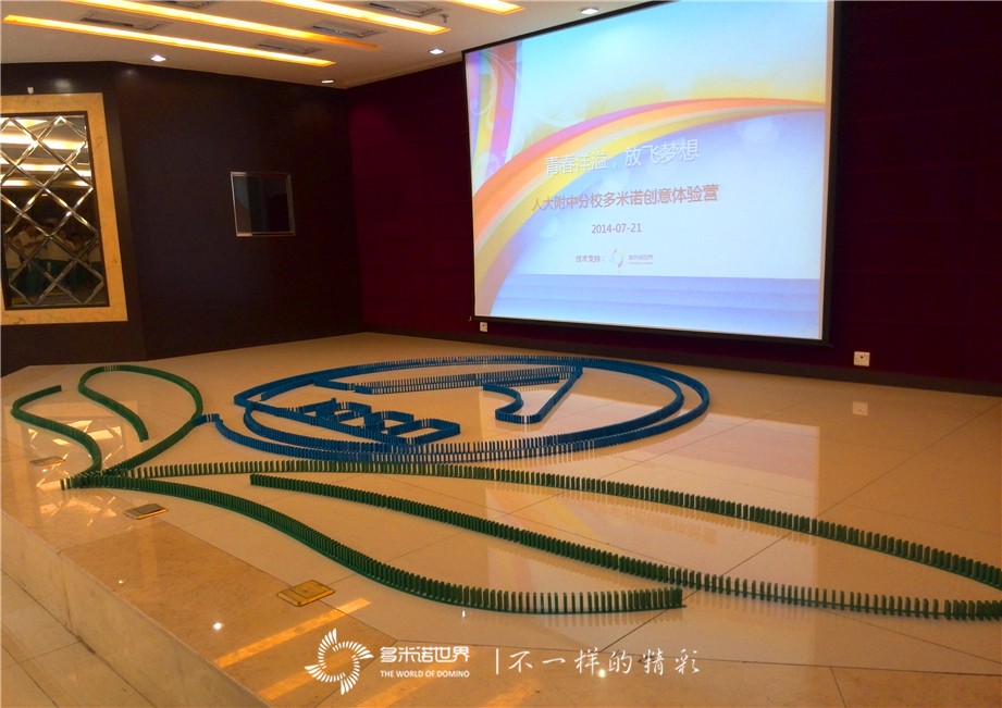 2014年7月21日,80余名人大附中學(xué)生干部來到風(fēng)景秀麗的十渡風(fēng)景區(qū),參加一年一度的夏令營活動。今年的夏令營,老師特別邀請了“多米諾世界”團隊,為同學(xué)們帶來了多米諾挑戰(zhàn)活動。大家在3個小時的時間里,充分體驗到了多米諾的無窮樂趣,了解了多米諾文化,并通過團隊的智慧和努力,創(chuàng)意出一幅幅精彩的多米諾作品。